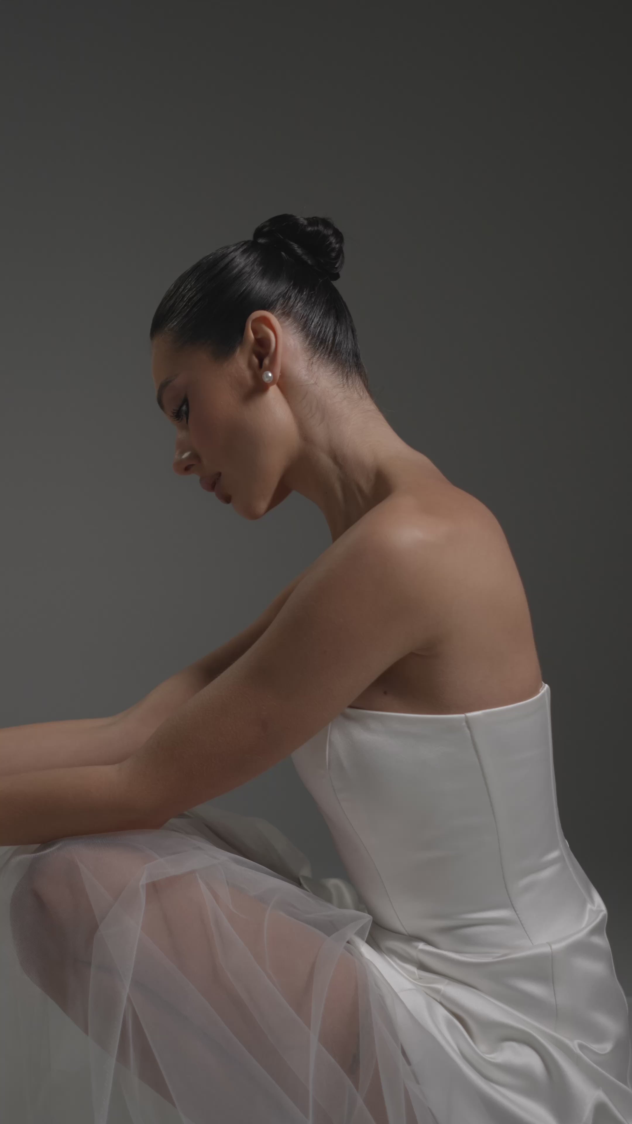 Базова міні з преміального сатину формує чіткий, скульптурний силует і підкреслює фігуру, а знімна спідниця з євросітки додає образу романтики, невагомості та весільної урочистості.